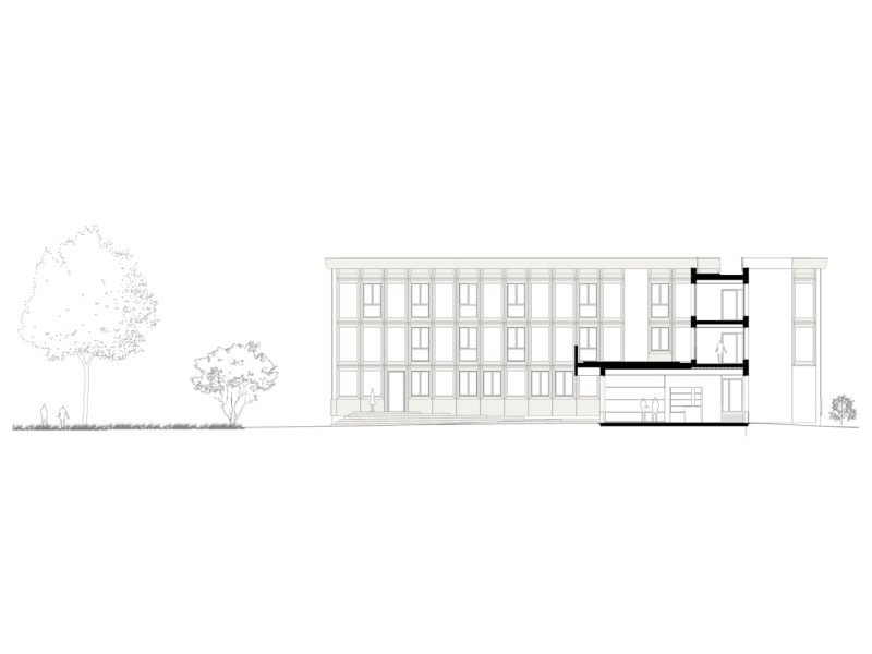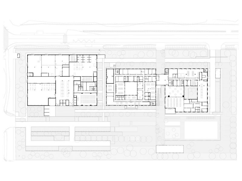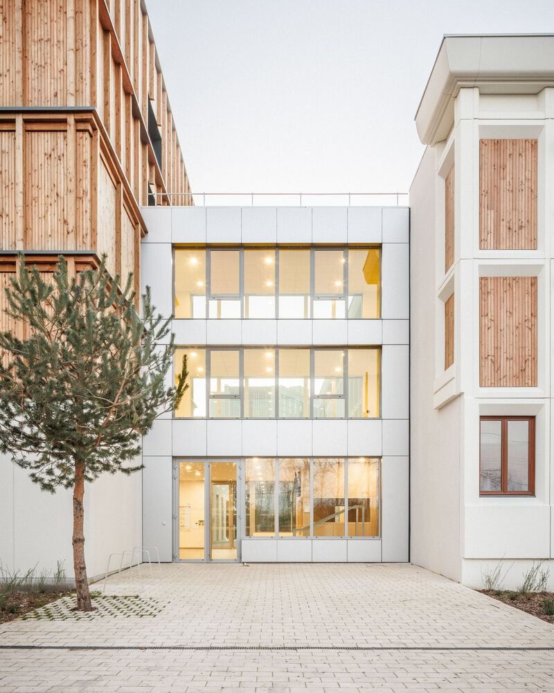 The central building is preserved and restructured to accommodate the reception and administration center, composed of offices and coworking spaces.